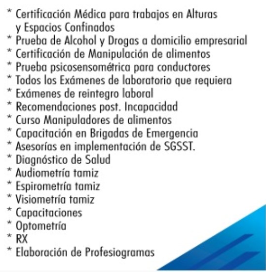 | Diaz Trujillo Asesores Asociados Ofrece los servicios en Seguridad y salud en el trabajo, contando con el recurso humano, la tecnología y la experiencia para la prestación del servicio con los más altos índices de calidad, abordando aspecto como. | ![]() |